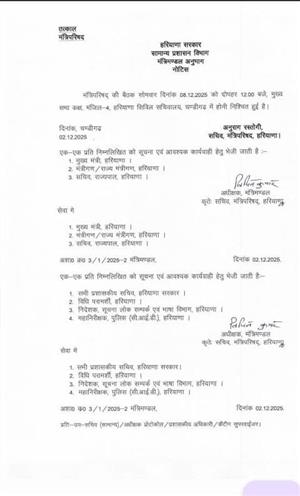 हरियाणा के मुख्यमंत्री श्री नायब सिंह सैनी की अध्यक्षता में आगामी 8 दिसंबर को दोपहर 12 बजे हरियाणा सिविल सचिवालय चंडीगढ़ की चौथी मंजिल पर स्थित मुख्य सभा कक्ष में हरियाणा मंत्रीपरिषद की बैठक होगी।