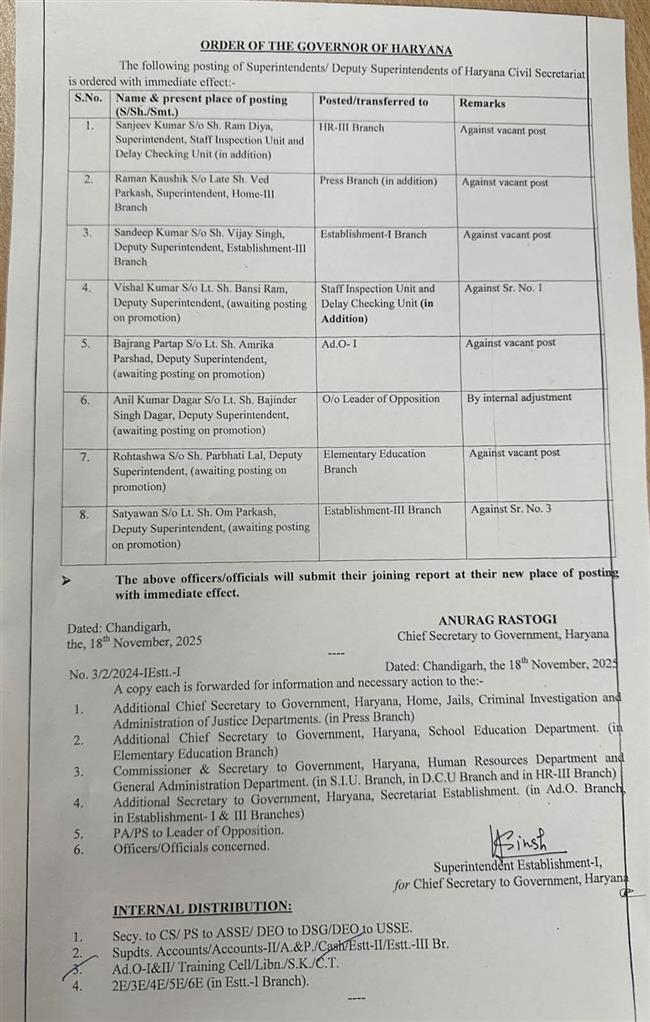 हरियाणा सरकार ने सिविलसचिवालय चंडीगढ़ में कार्यरत पदोन्नति पाए सभी डिप्टी सुपरिंटेंडेंट को सौंपी ब्रांच की जिम्मेदारी*