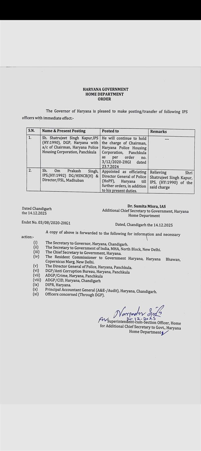 कार्यवाहक DGP OP SINGH को अपने मौजूदा कर्तव्यों के अलावा अगले आदेश तक, उन्हें हरियाणा के कार्यवाहक पुलिस महानिदेशक (HoPF) के रूप में नियुक्त किया गया है।