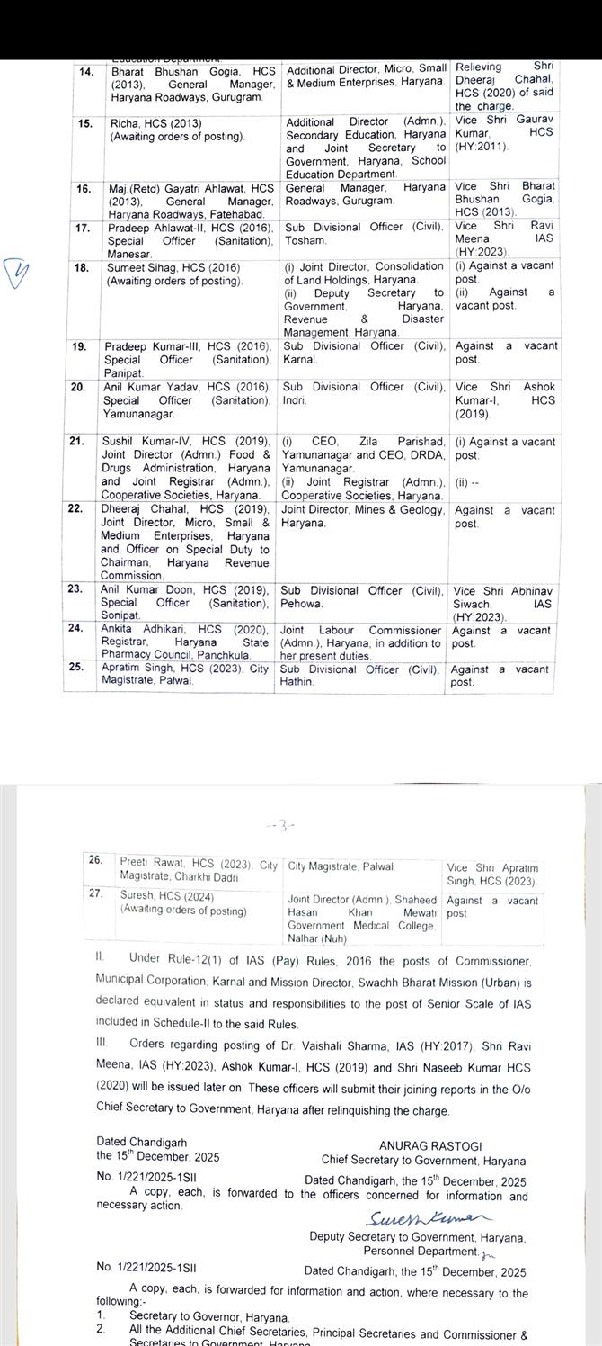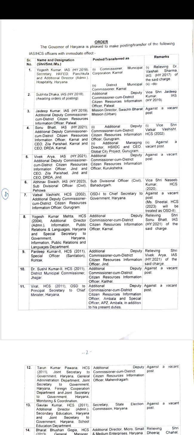 हरियाणा सरकार ने 6 आईएएस और 21 HCS अधिकारियों का किए तबादले