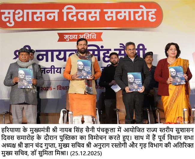 हरियाणा के मुख्यमंत्री श्री नायब सिंह सैनी ने पारदर्शी, जवाबदेह और नागरिक-केंद्रित प्रशासन के प्रति सरकार की प्रतिबद्धता को दोहराते हुए मुख्यमंत्री श्री नायब सिंह सैनी ने कहा कि सुशासन एक विकसित भारत और एक विकसित हरियाणा बनाने के लिए सबसे मजबूत स्तंभ है। राज्य सरकार अपनी सेवाओं को एक मिशन के रूप में ले रही है और हम ऐसा हरियाणा बनाने के लिए संकल्पबद्ध हैं, जहां न्याय सुलभ हो, सेवा त्वरित हो और हर नागरिक सशक्त हो, यही सच्चा सुशासन है।