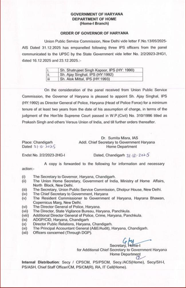 चंडीगढ़:अजय सिंघल हरियाणा के नए DGP बने, आदेश हुए जारी