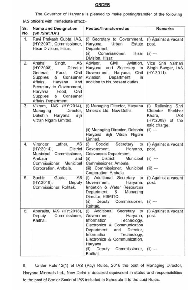 हरियाणा सरकार ने 6 IAS अधिकारियों के नियुक्ति एवं तबादले