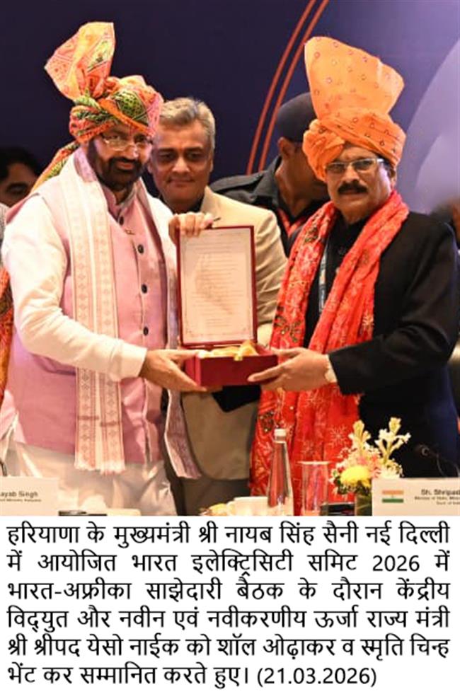 मुख्यमंत्री श्री नायब सिंह सैनी शुक्रवार को भारत इलेक्ट्रिसिटी समिट— 2026  के अंतर्गत नई दिल्ली में आयोजित भारत–अफ्रीका सामरिक साझेदारी बैठक को संबोधित कर रहे थे। कार्यक्रम की अध्यक्षता केंद्रीय उर्जा एवं आवासन मंत्री श्री मनोहर लाल ने की, जबकि केंद्रीय ऊर्जा एवं नवीन एवं नवीकरणीय ऊर्जा राज्य मंत्री श्री श्रीपद येस्सो नाइक ने भी समिट को संबोधित किया।
