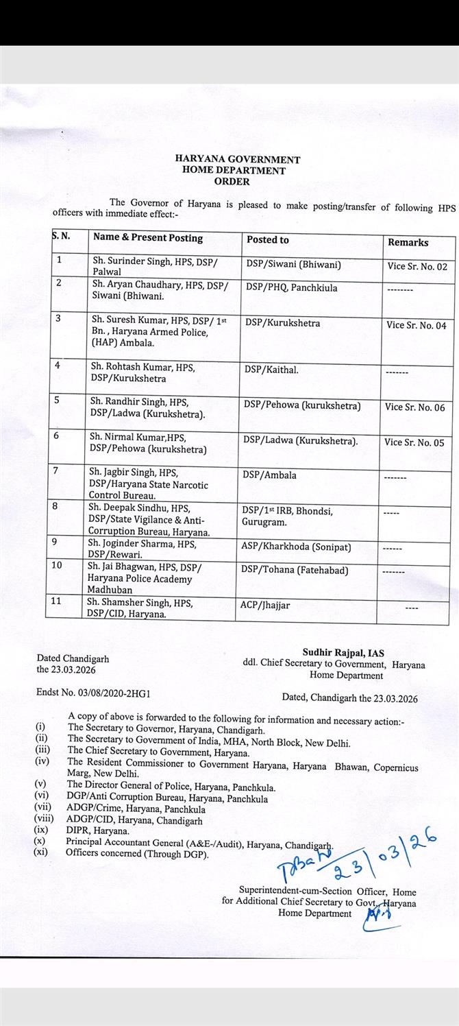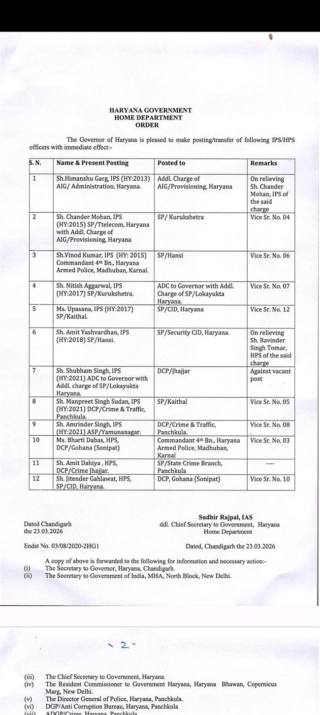 हरियाणा सरकार ने 9 आईपीएस और 14 एचपीएस अधिकारियों का किया तबादला