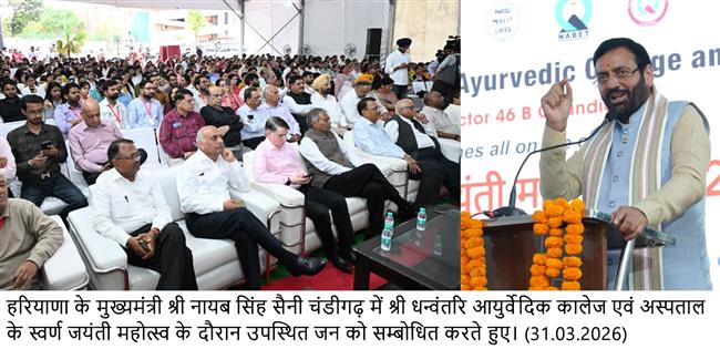 हरियाणा के मुख्यमंत्री श्री नायब सिंह सैनी ने चंडीगढ़ में आयोजित श्री धन्वंतरि आयुर्वेदिक कॉलेज एवं अस्पताल के स्वर्ण जयंती समारोह को संबोधित करते हुए कहा कि आधुनिक जीवनशैली से उत्पन्न तनाव, मधुमेह, उच्च रक्तचाप और अन्य जीवनशैली संबंधी रोगों के समाधान में आयुर्वेद एक प्रभावी और टिकाऊ विकल्प प्रदान करता है। आयुर्वेद में शारीरिक स्वास्थ्य के साथ-साथ मानसिक और आध्यात्मिक संतुलन पर भी बल दिया जाता है।
