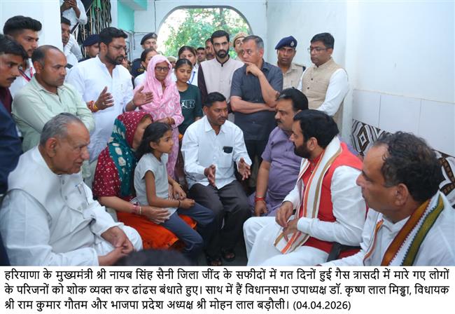 मुख्यमंत्री श्री नायब सिंह सैनी सफीदों में गत दिनों हुई गैस त्रासदी में मृतकों के परिजनों से उनके आवास पर जाकर मिले। मुख्यमंत्री ने पीड़ित परिवारों को ढ़ाढस बंधाते हुए कहा कि ऐसी दुखद घटना किसी के साथ ना हो। मुख्यमंत्री ने कहा कि परिवार पर दुख का जो पहाड़ टुटा है इस घड़ी में सरकार पुर्णतयाः पीड़ितों के साथ है और उनकी हर संभव मदद की जाएगी। पीड़ितों को आश्वस्त करते हुए मुख्यमंत्री ने कहा कि बच्चों की शिक्षा और घायलों के इलाज का खर्चा सरकार वजन करेगी। उन्होंने यह भी कहा कि पीड़ितों को पूरा न्याय मिलेगा और दोषियों को बक्शा नहीं जाएगा।