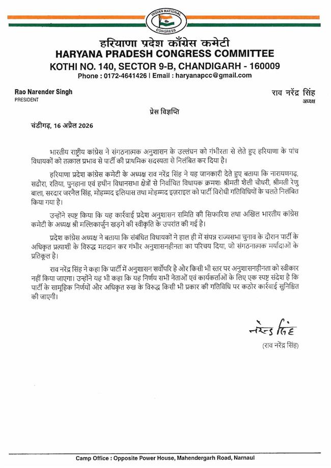 चंडीगढ़ : राज्य सभा चुनाव में क्रॉस वोटिंग करने वाले 5 कांग्रेसी विधायकों पर गिरी गाज, कांग्रेस हाई कमान ने पाँचों विधायकों को किया सस्पेंड…