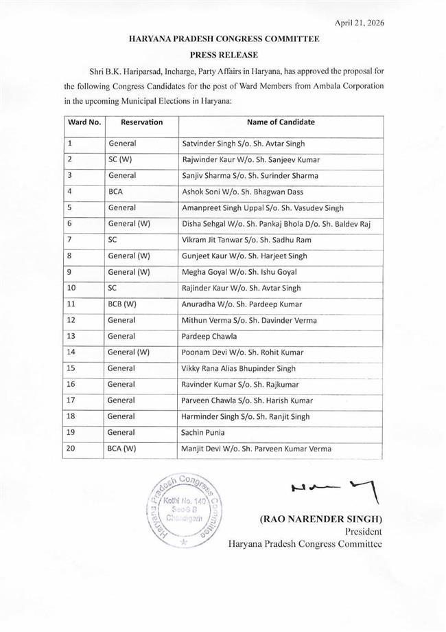 अंबाला नगर निगम चुनाव हेतु कांग्रेस ने जारी की अपने सभी 20 वार्डों के उम्मीदवारों की लिस्ट