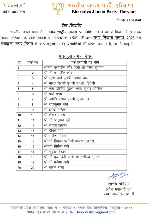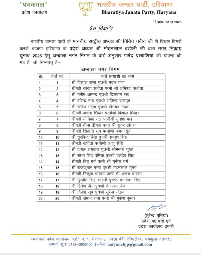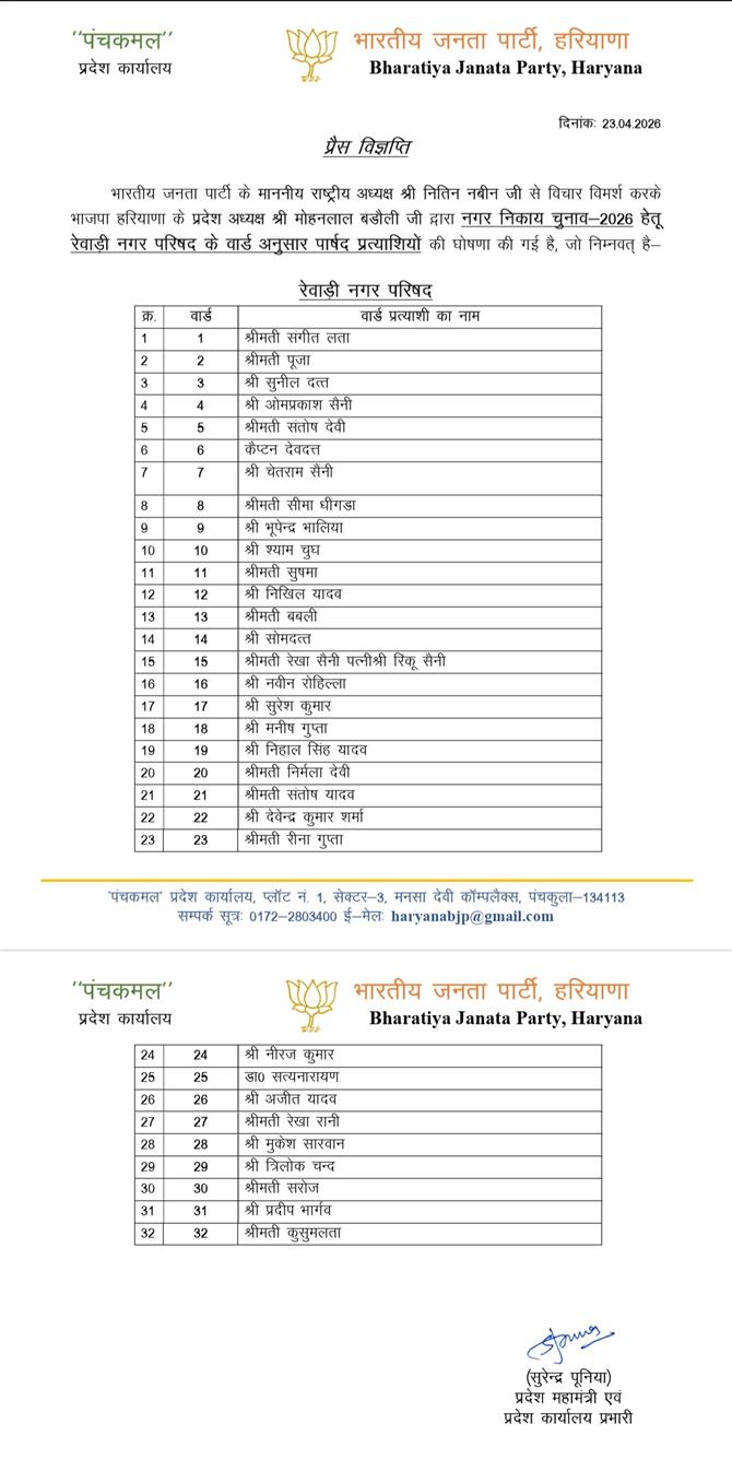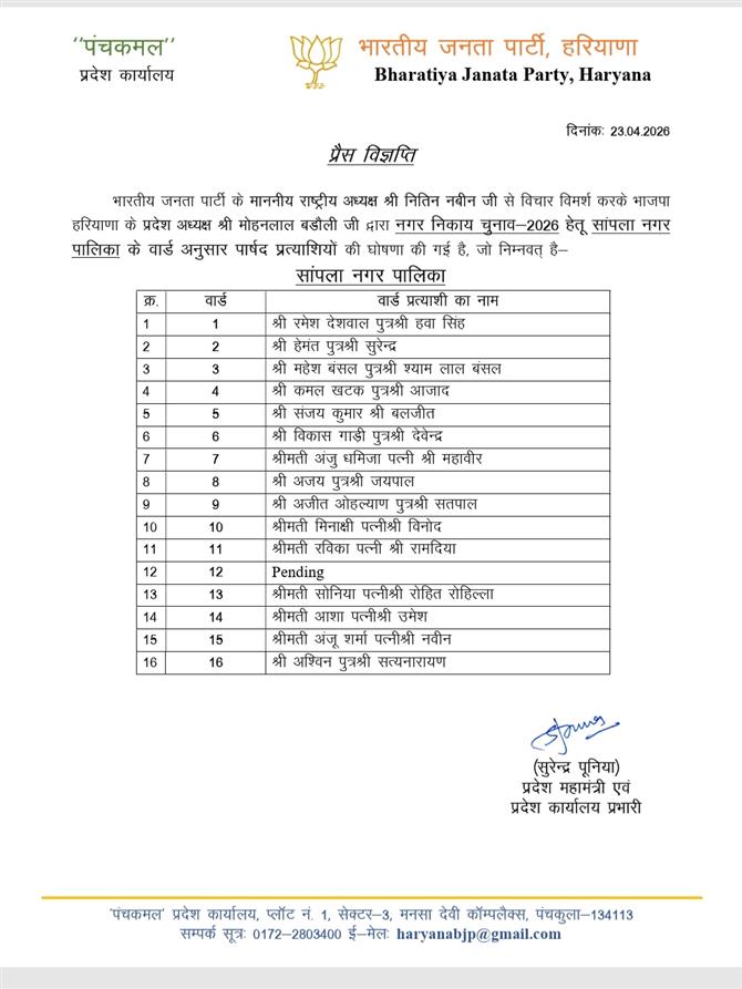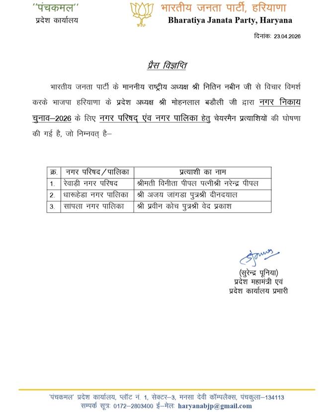 हरियाणा में BJP ने पालिका-परिषद प्रत्याशी किए घोषितः सांपला में प्रवीन कोच, रेवाड़ी में विनीता और धारूहेड़ा में अजय जांगड़ा को मौका